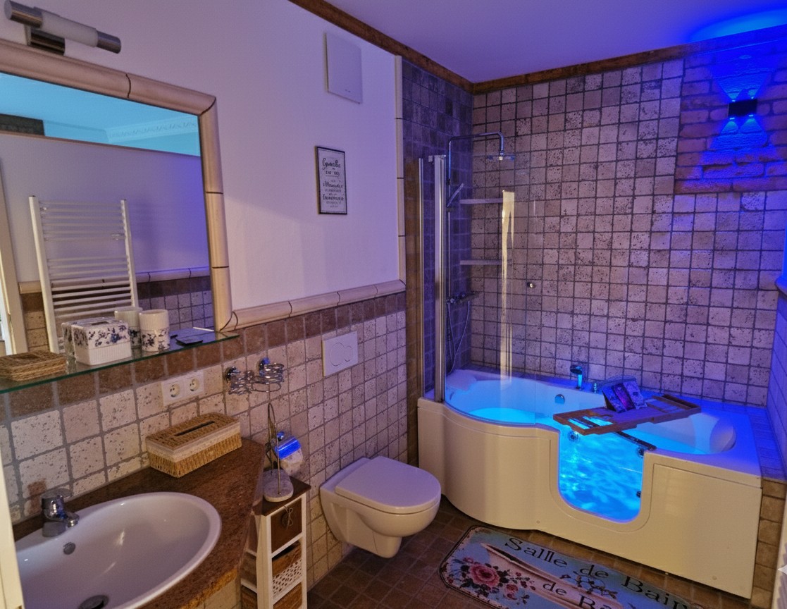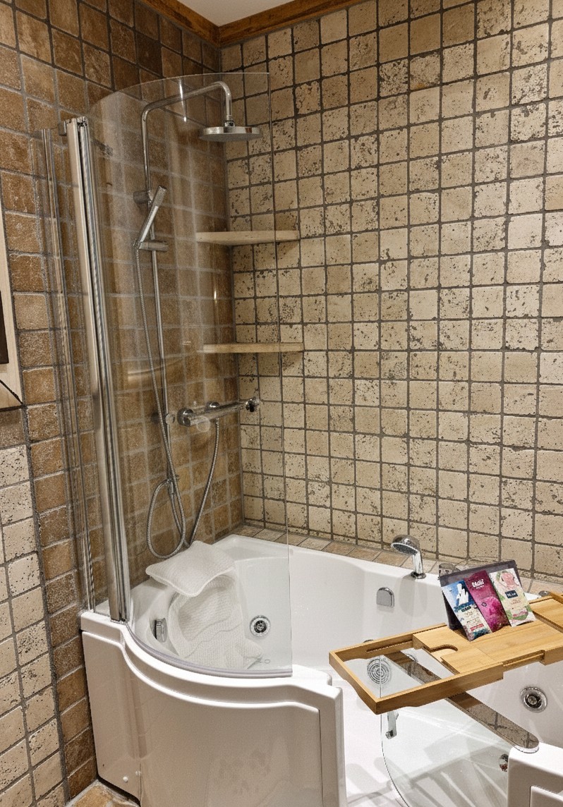 Sicheres Badevergnügen: Das Badezimmer verfügt über eine seniorenfreundliche Whirlpool-Dusch-Badewanne mit integrierter Einstiegstür. Genießen Sie ein entspannendes Bad oder nutzen Sie die Wanne bequem als Dusche, ohne über hohe Ränder steigen zu müssen.